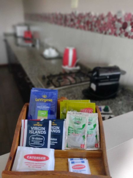 - Desayuno seco diario (café, te, leche –en saquitos- yogur, cereales, frutas de estación, endulzantes, manteca, mermelada, jugo de naranja, jamón, queso, criollos, medialunas, pan blanco), servido en el mismo departamento a partir del día siguiente al ingreso de 7 a 10 hs. También puede solicitar su reserva sin este servicio con una tarifa especial.